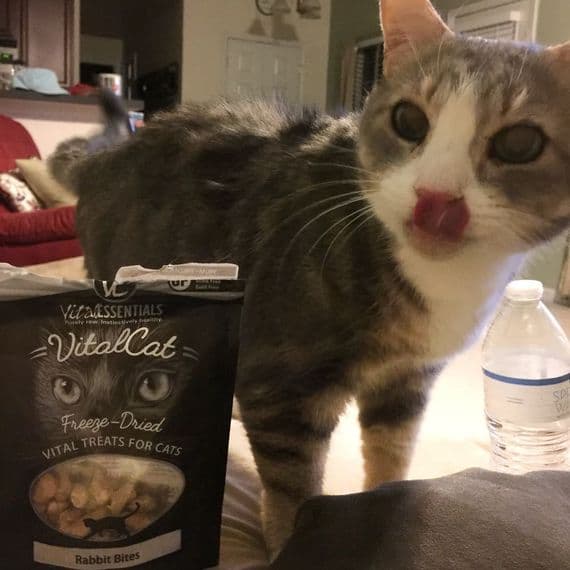 The picture shows how much my cat Shelby loves the treat. Pictured: Freeze-Dried Vital Cat Rabbit Bites.