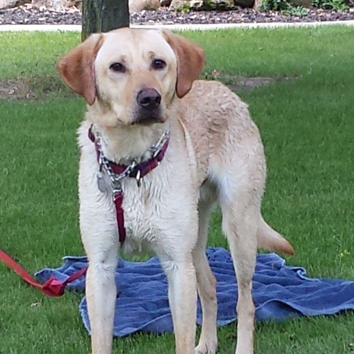 This is Phoenix. She is a year and a half old Lab Terrier mix. I broke her out of doggy jail at the Humane Society in the Fox Valley at the end of June. When I got her you could see all of her ribs. She was very timid and shy. She now is a very happy, healthy, energetic dog. You cannot see her ribs and her coat is nice and shiny. She loves playing with kids. I have a 7 year old that she adores. She is a lap dog. She loves snuggling in blankets. She is very good playing with dogs her size or bigger as she likes to play rough and run fast. We are very happy to have her as an addition to our family.